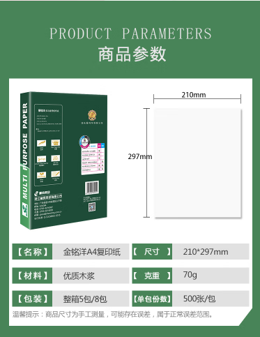 參數(shù) [品牌] 晨鳴 [型號] 70克A4-5包 [毛重] 11.5kg [產地] 中國大陸 [單位] 箱