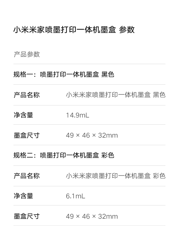 參數(shù) [品牌] 小米 [型號(hào)] 小米米家噴墨打印一體機(jī)彩色墨盒 [產(chǎn)地] 中國(guó)大陸 [類型] 墨盒 [單位] 個(gè)